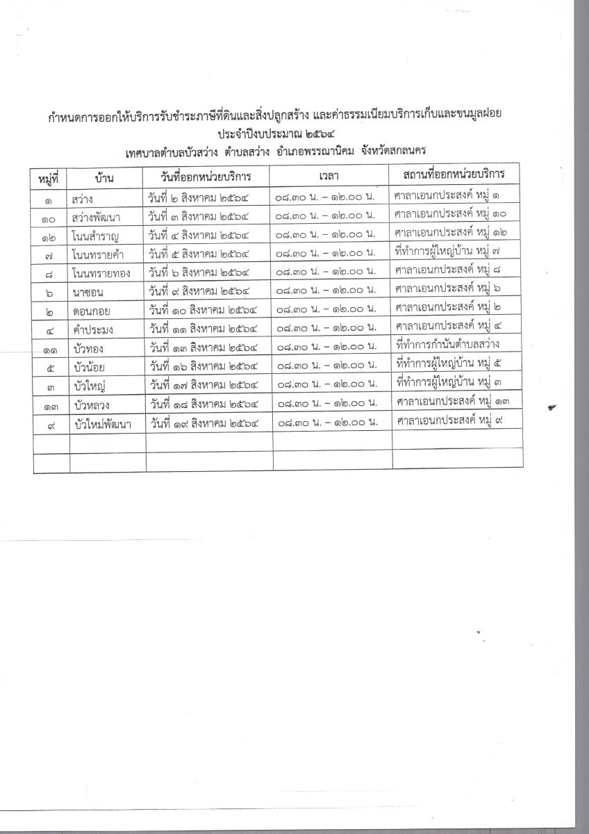 ประชาสัมพันธ์ การออกให้บริการรับชำระภาษีที่ดิและสิ่งปลูกสร้าง และค่าธรรมเนียมเก็บและขนขยะมูลฝอย ประจำปีงบประมาณ 2564
