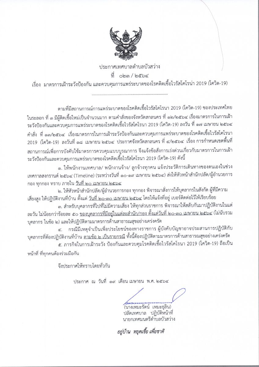 ประกาศเทศบาลตำบลบัวสว่างเรื่อง มาตรการเฝ้าระวังป้องกันและควบคุมการแพร่ระบาดของโรคติดเชื้อไวรัสโคโรน่า 2019 (โควิด-19)