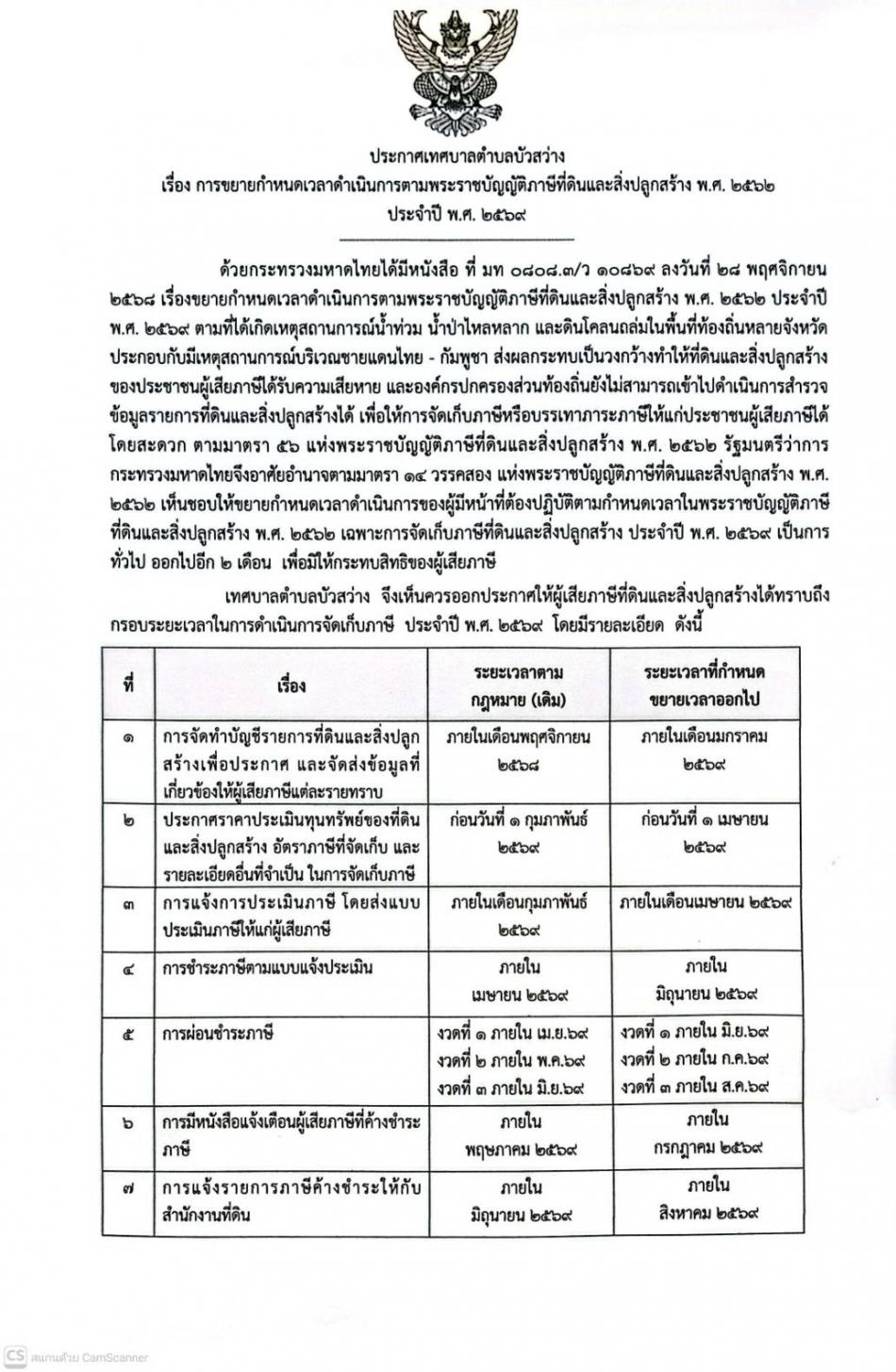 ประกาศเทศบาลตำบลบัวสว่าง เรื่อง การขยายกำหนดเวลาดำเนินการตามพระราชบัญญัติภาษีที่ดินและสิ่งปลูกสร้าง พ.ศ. 2562 ประจำปี พ.ศ. 2569