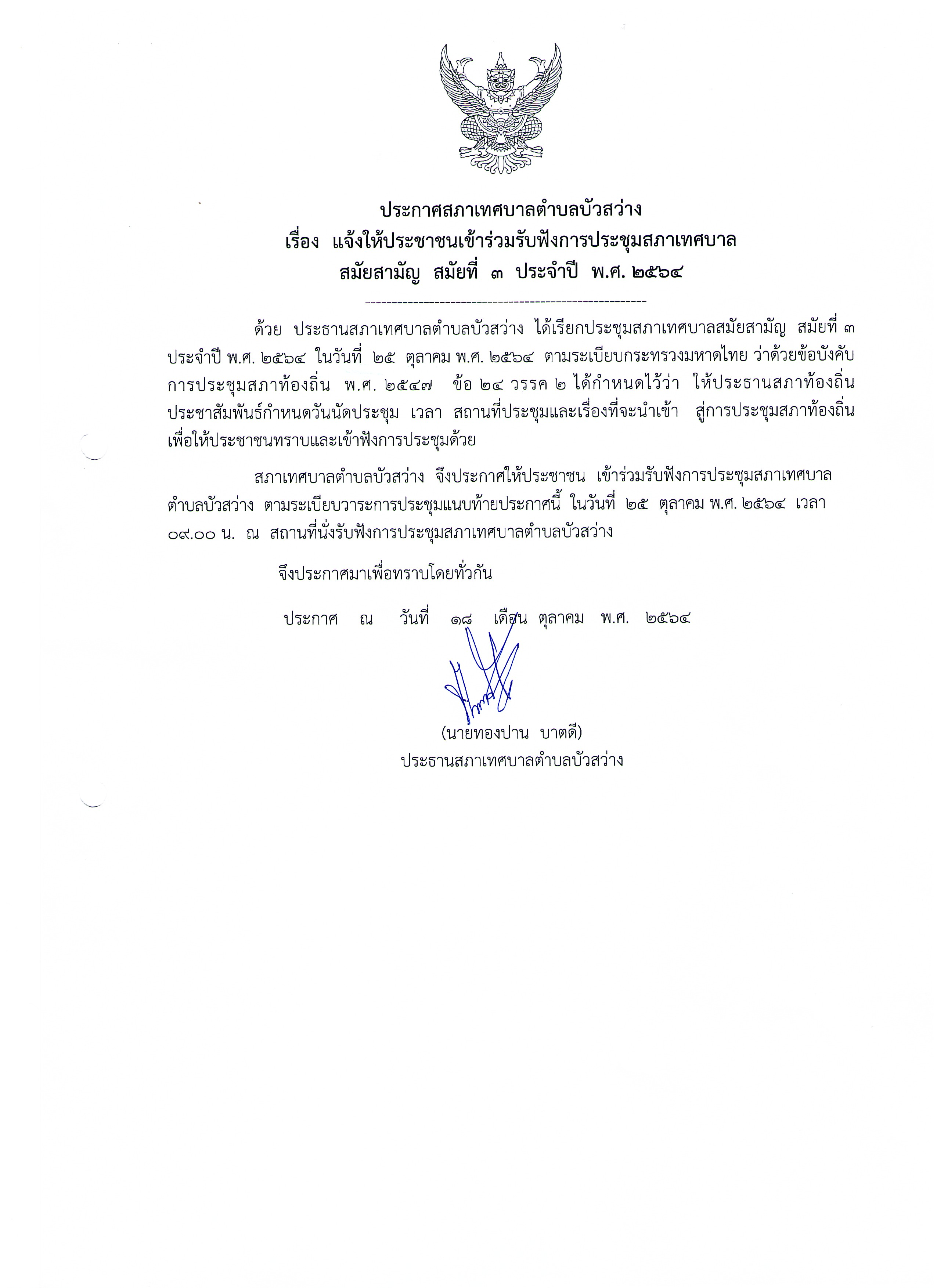 ประกาศเทศบาลตำบลบัวสว่าง เรื่อง แจ้งให้ประชาชนเข้าร่วมรับฟังการประชุมสภาเทศบาล สมัยสามัญ สมัยที่ 3 ประจำปี พ.ศ. 2564